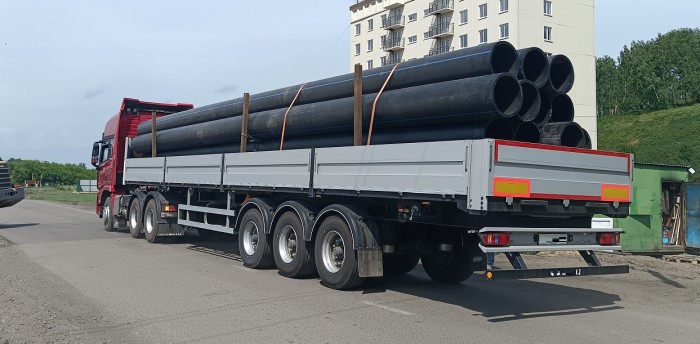 Кроме того, транспортировка труб каждого вида осуществляется по определенным правилам. Чтобы перевезти изделий малого диаметра, их укладывают пучками. Для изделий среднего диаметра предусмотрено закрепление тросами или стяжками. Перевозка труб большого диаметра (более 4м) выполняется по одной штуке при помощи полуприцепов (тралов, трубовозов, роспусков, железнодорожных платформ)